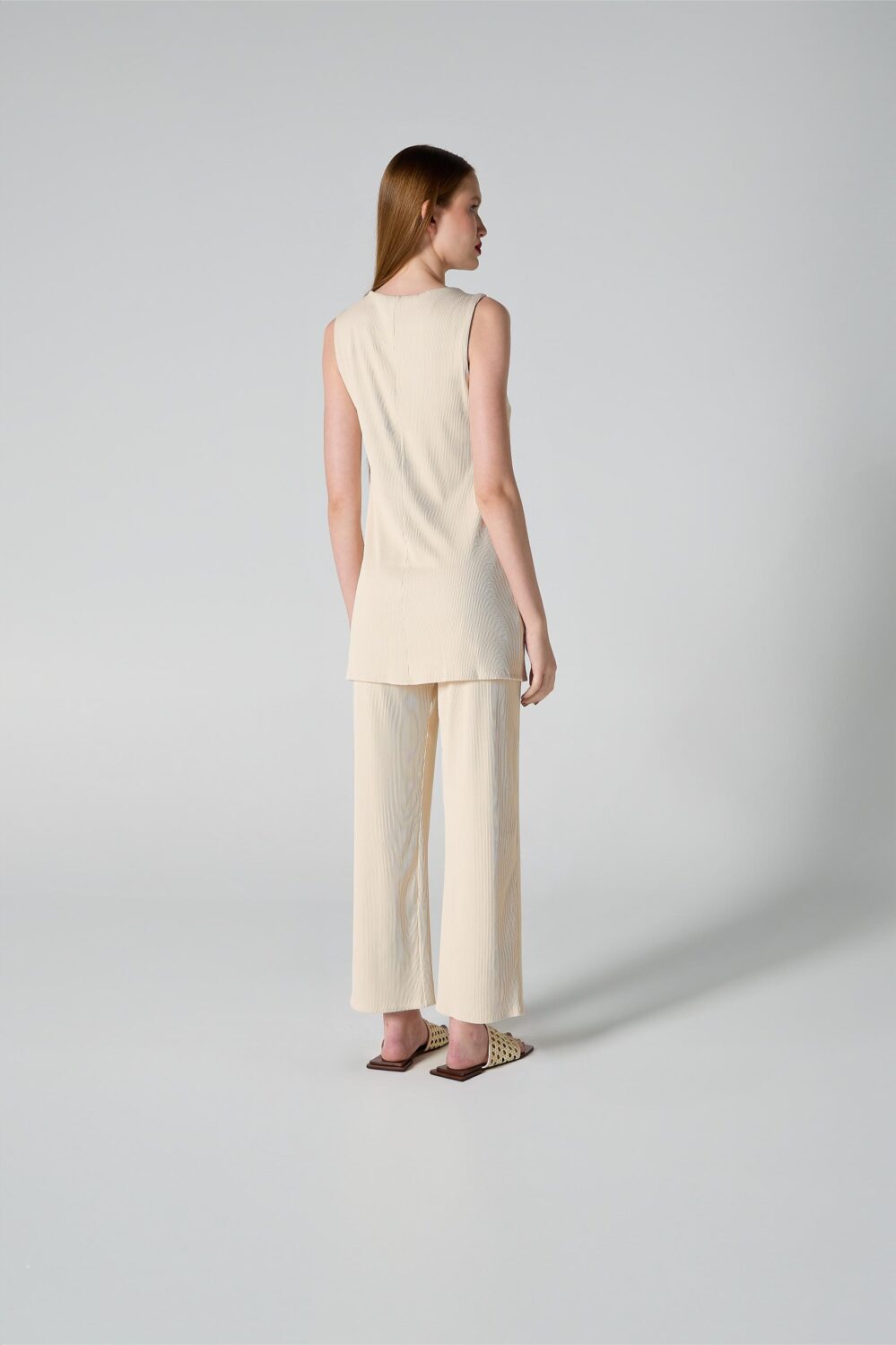 A Calça Edilah é encantadora na tonalidade off-white, sem transparência, feita com tecido de alta qualidade de poliamida e elastano de caimento fluido e corte elegante. Com qualidade elevada e acabamento refinado, transmite leveza e movimento ao caminhar. O modelo apresenta cintura alta, cós largo e barra levemente flare, criando uma silhueta contemporânea e confortável.