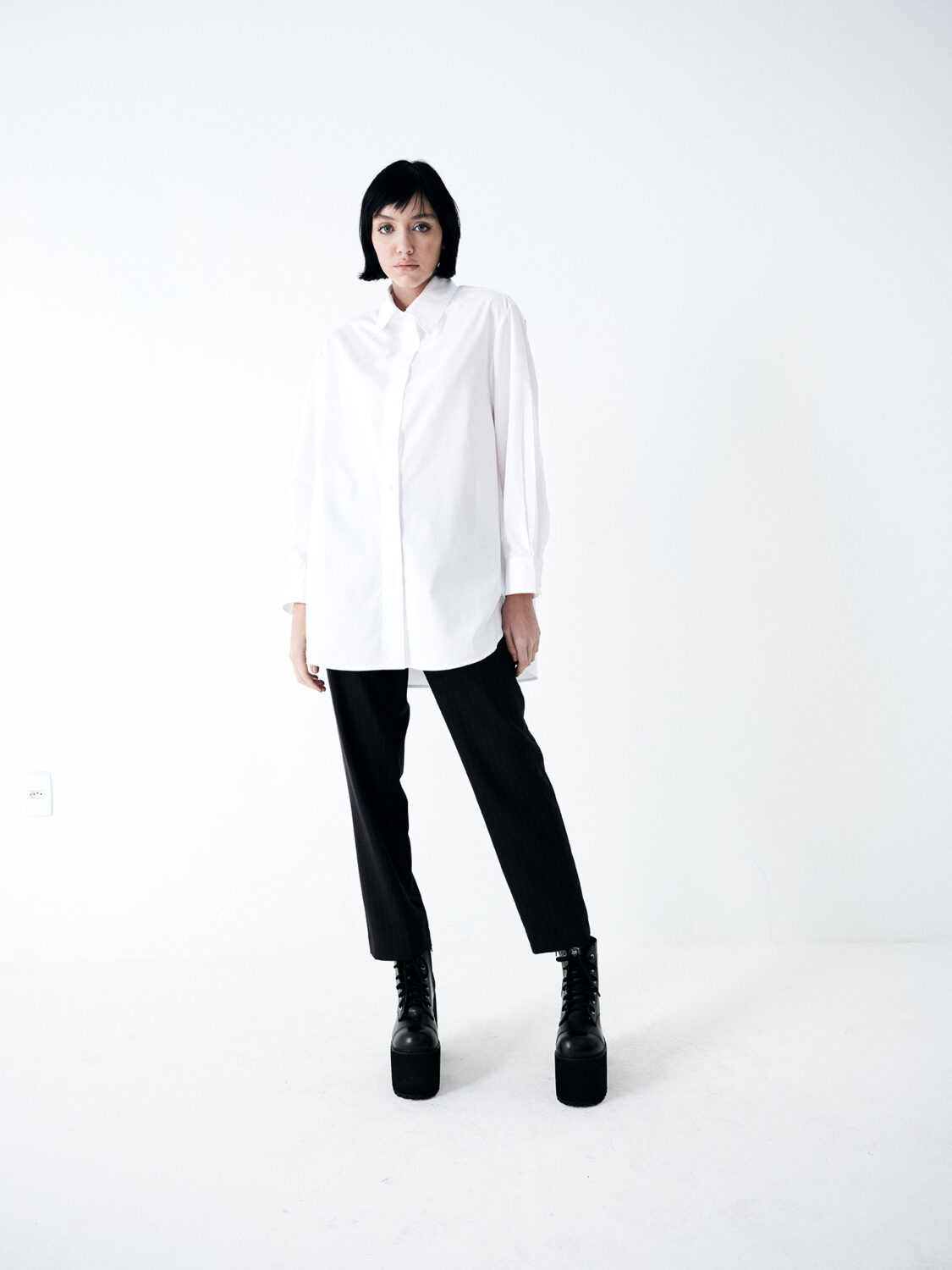 O design alongado e a ausência de detalhes visíveis reforçam sua estética clean. Uma camisa branca feminina ideal para produções urbanas com atitude, perfeita para quem busca elegância com personalidade.