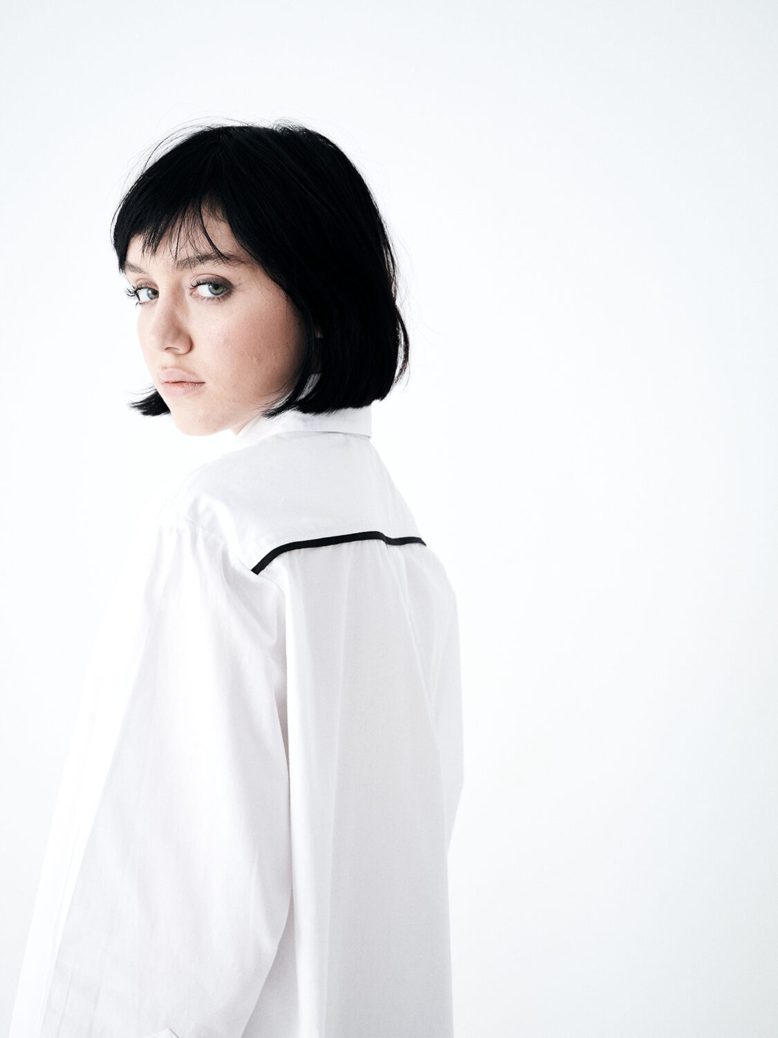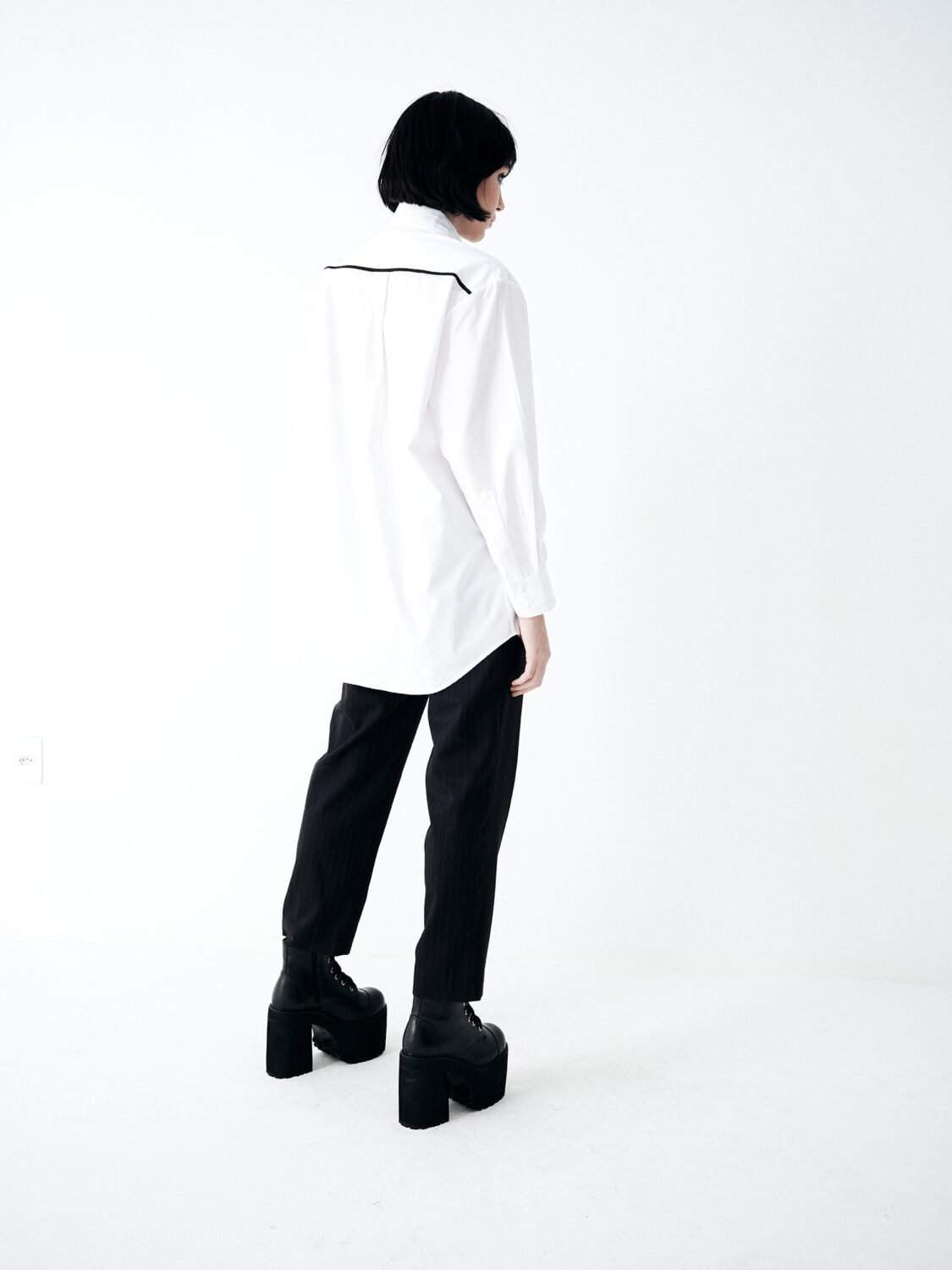 A Camisa Edilah é distinta e minimalista, feita em algodão branco com caimento leve e toque macio. Com modelagem oversized, ombros estruturados e mangas amplas, oferece um visual moderno e despojado com acabamento de alta qualidade.