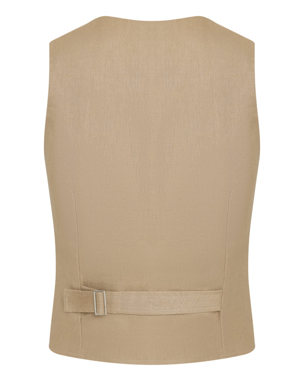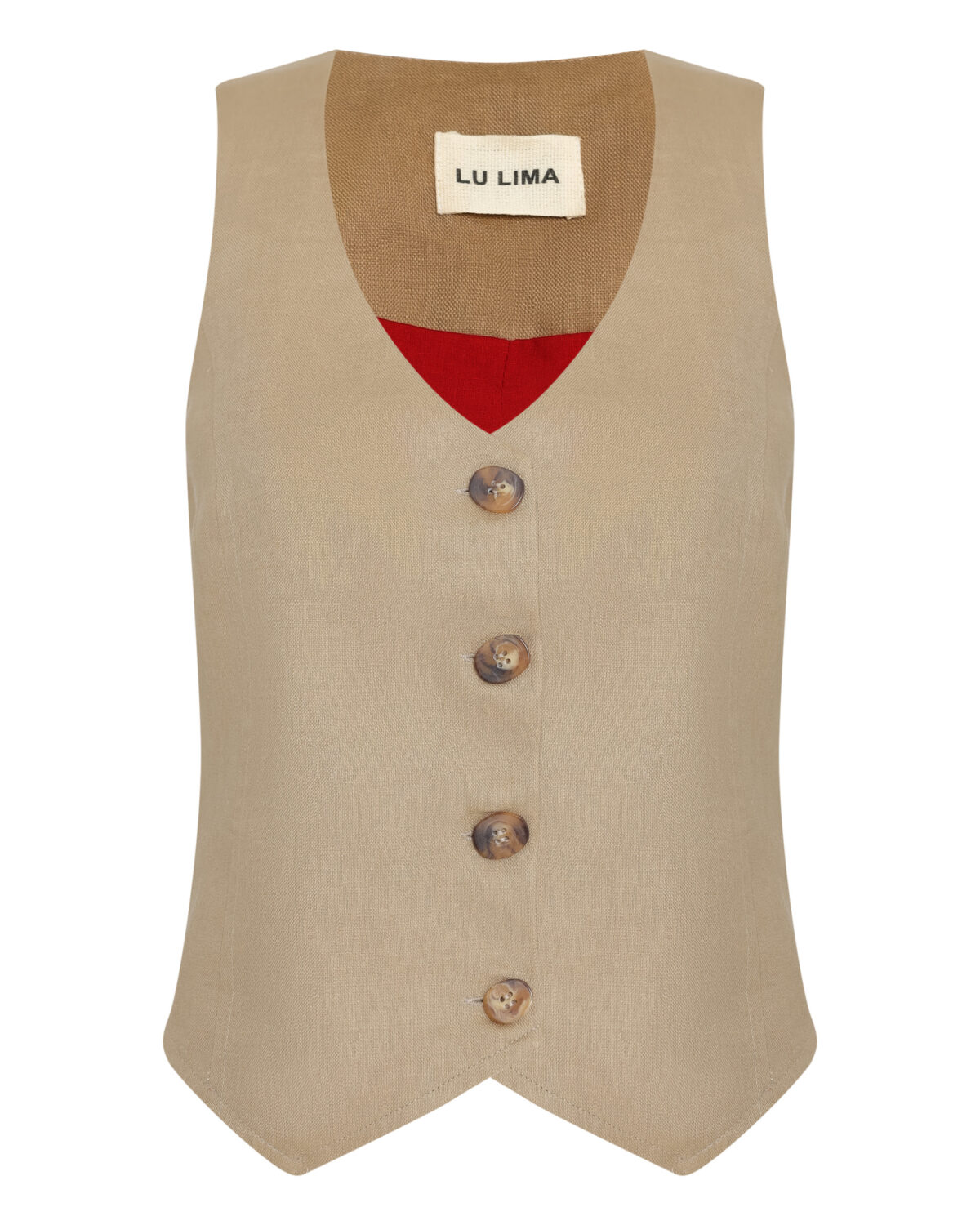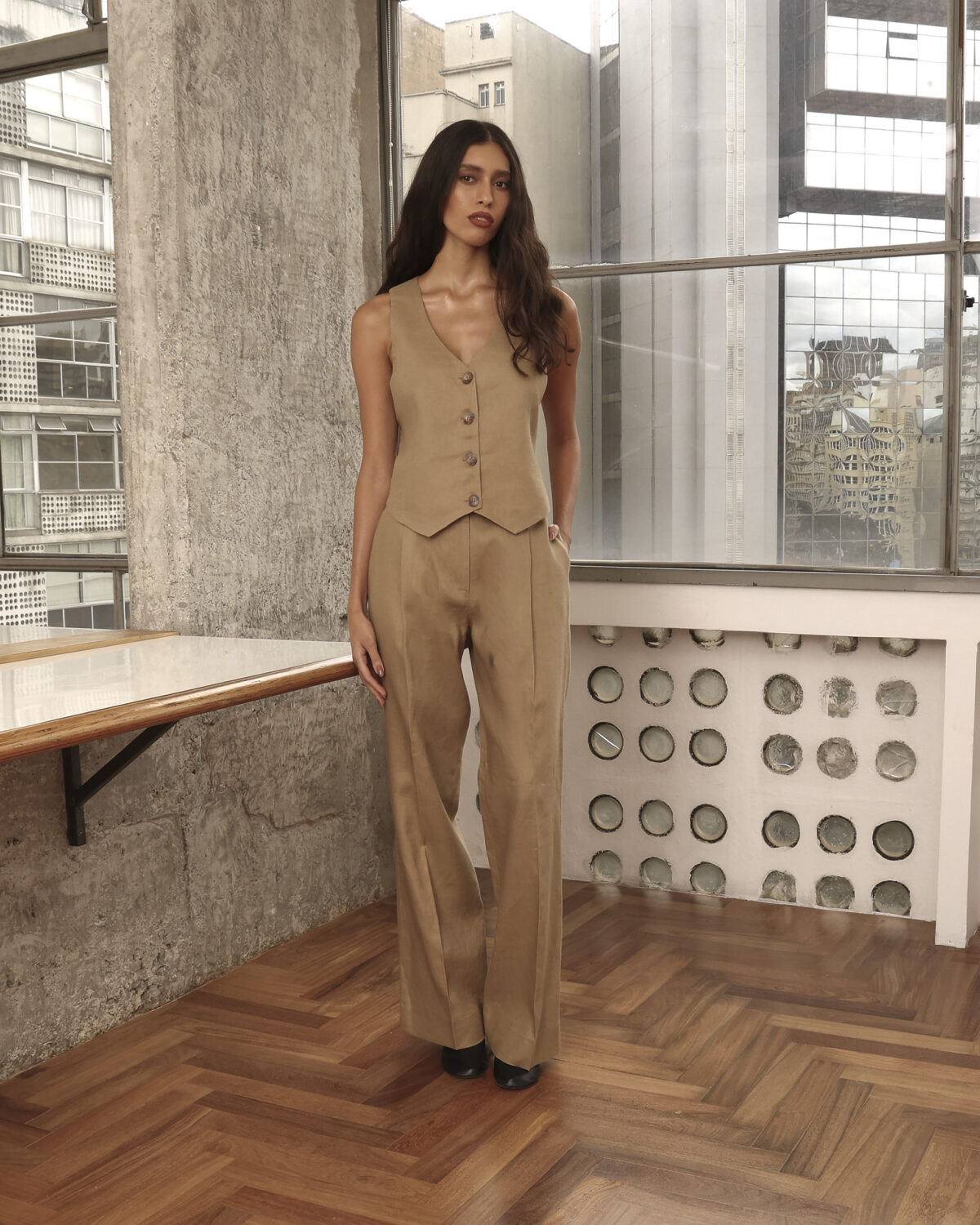 O Colete Andrea Bege é feito em linho encorpado, com modelagem de alfaiataria, sem mangas e estrutura firme. Apresenta corte reto, lapela clássica e botões frontais funcionais, que reforçam o estilo sofisticado da peça. Seu comprimento levemente alongado, que vai abaixo da cintura sem cobrir o quadril, traz um toque contemporâneo. Uma peça versátil para compor looks elegantes com camisas, malhas leves ou vestidos ajustados.