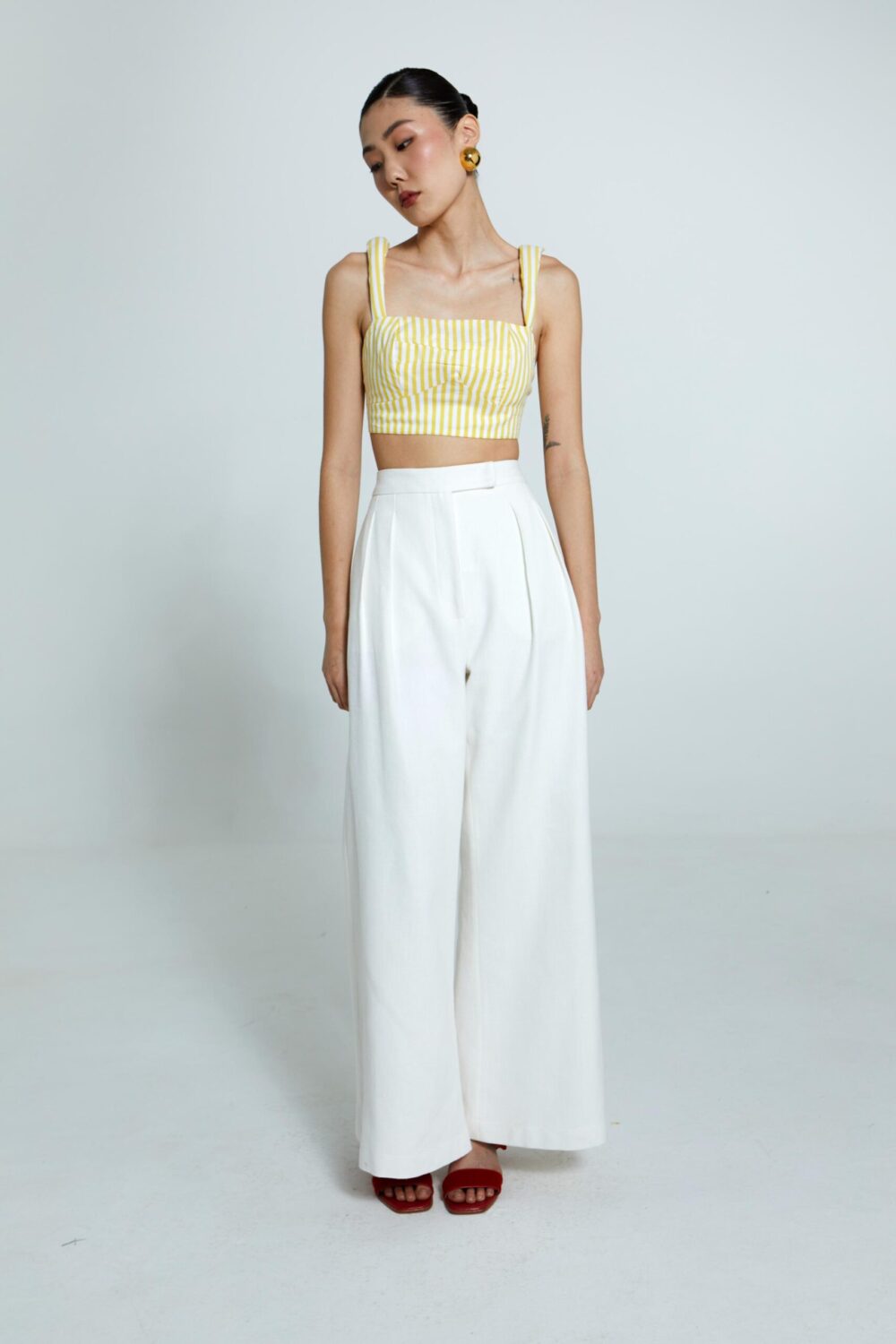 O Top Helena traz frescor e charme à composição com suas listras amarelas e brancas em tecido encorpado. A modelagem estruturada com recortes no busto valoriza o colo, enquanto as alças largas conferem um toque moderno e confortável.