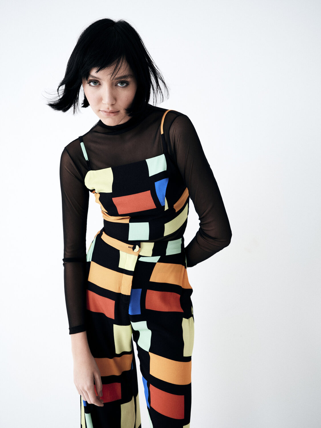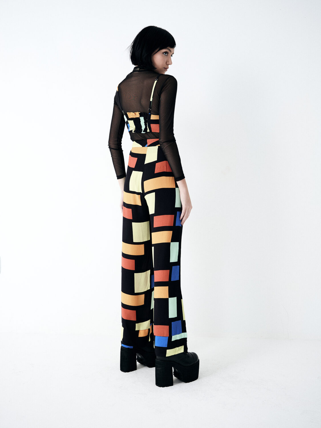 Inspirado na estética geométrica de Mondrian, o Top Vera é feito em crepe leve 100% viscose, com recortes estratégicos e elástico posterior que garante ajuste confortável ao corpo. A estampa vibrante e cheia de personalidade reforça sua proposta artística e ousada.