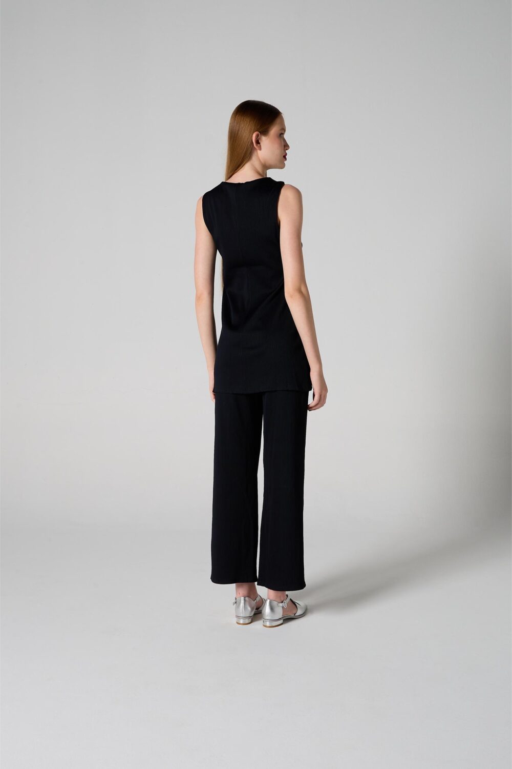 A Túnica Edilah Preta combina minimalismo e elegância com um toque urbano. Com modelagem alongada e corte reto, é feita em malha canelada de alta qualidade — viscose e elastano — oferecendo caimento impecável e textura refinada.