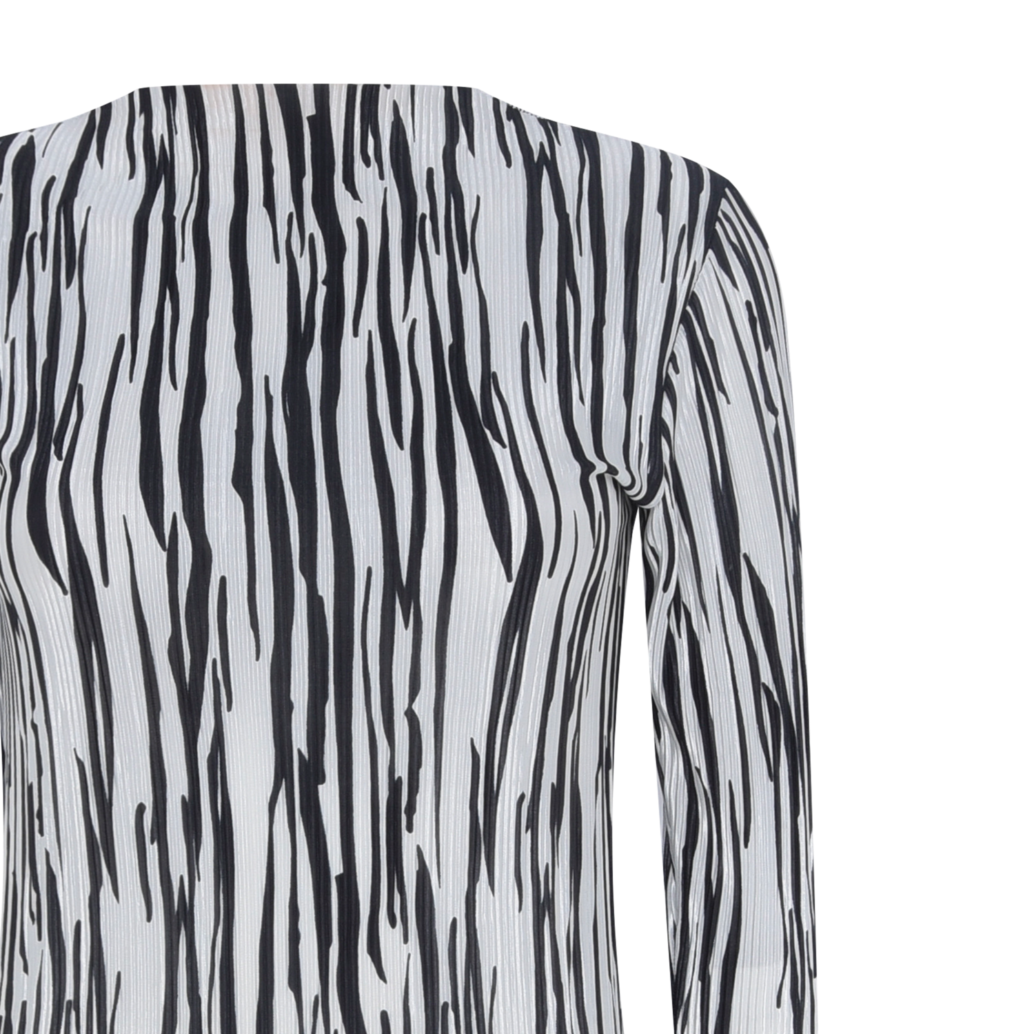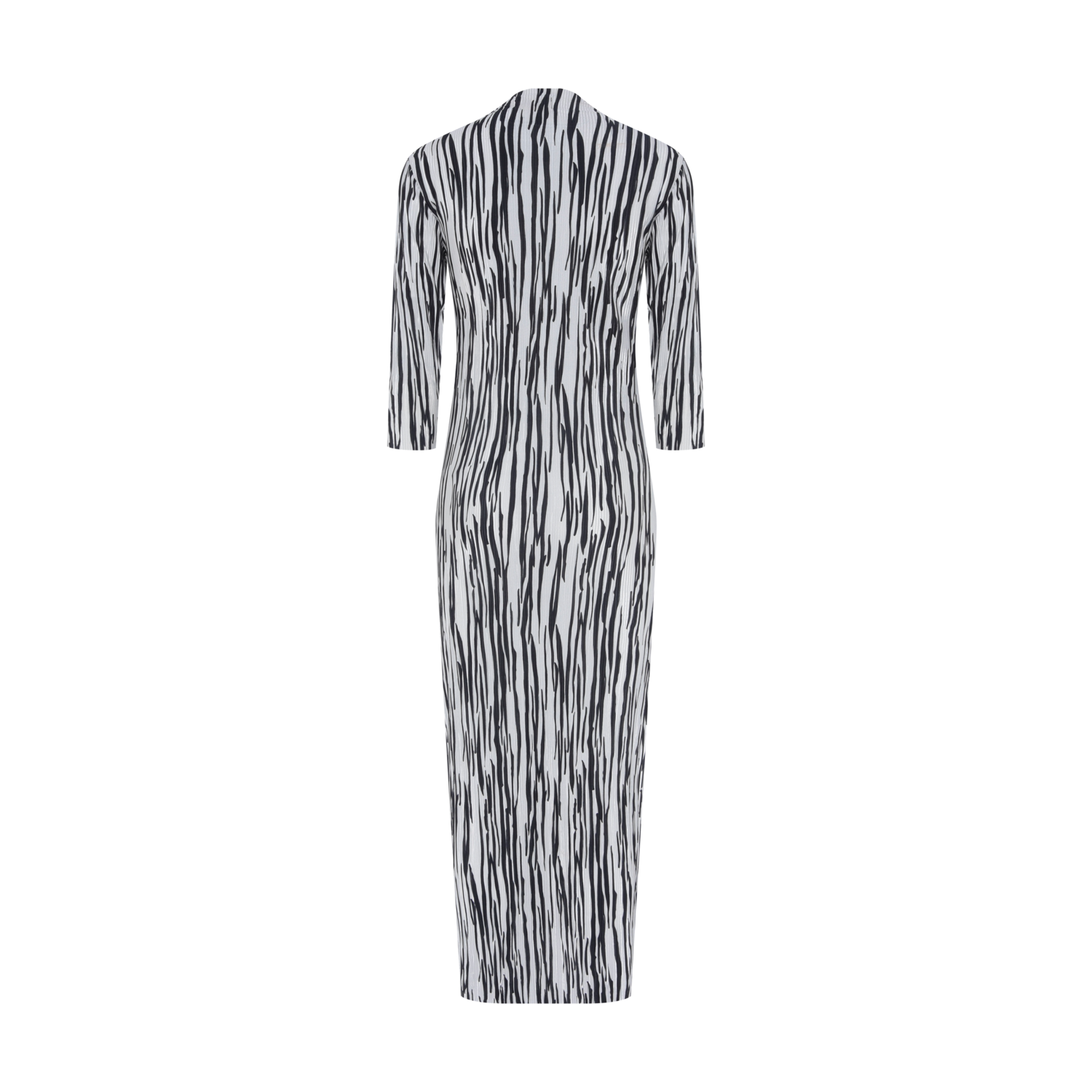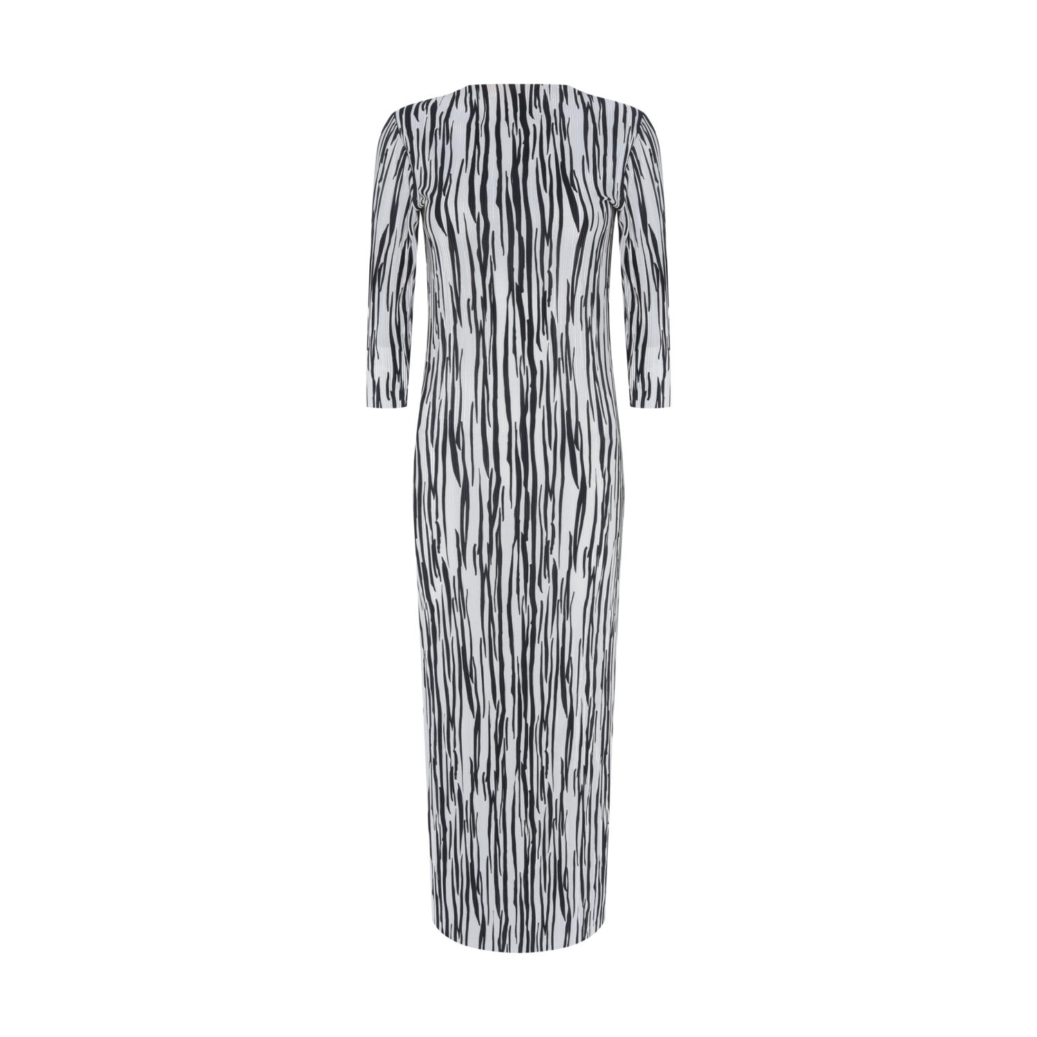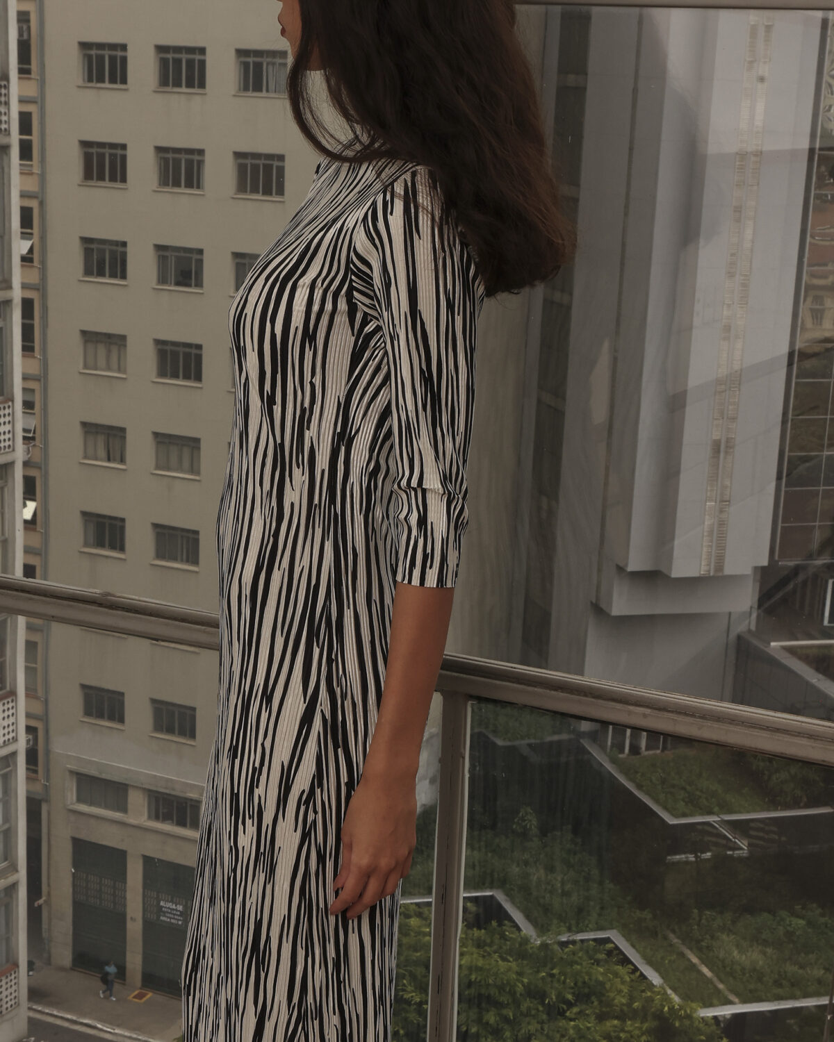 O Vestido Sara é feito em tecido de poliéster com estampa listrada em preto e branco, unindo caimento leve com estrutura marcante. De comprimento longo e mangas que ultrapassam levemente os cotovelos, combina fluidez com presença.